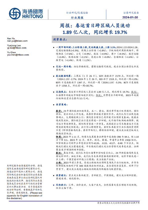 【海通国际】【20240130】交通运输行业周报:春运首日跨区域人员流动1.89亿人次,同比增长19.7%-18页