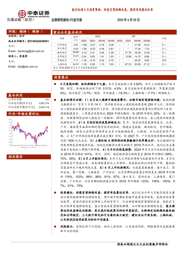 【中泰证券】【20240603】航空机场6月投资策略:供需有望持续改善,提前布局暑运旺季-15页