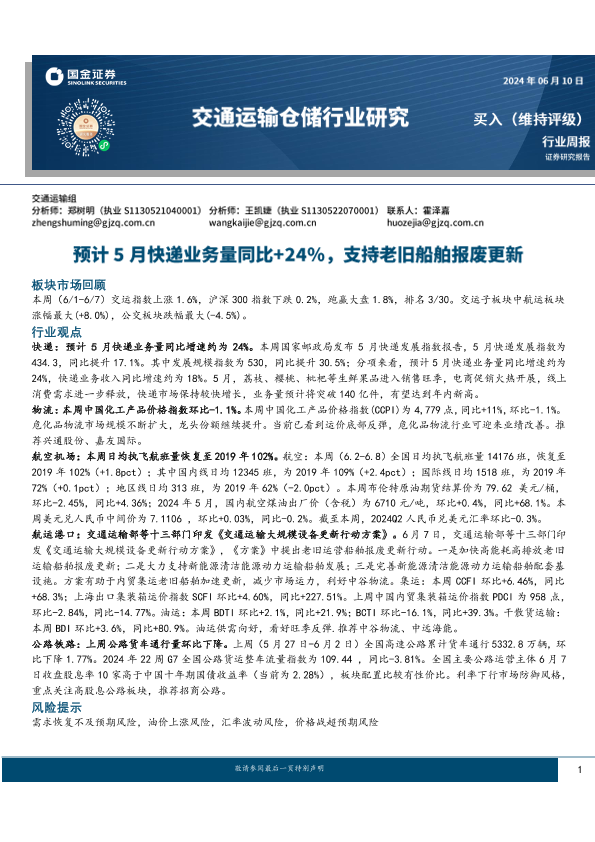 【国金证券】【20240610】交通运输仓储行业研究:预计5月快递业务量同比+24%,支持老旧船舶报废更新-17页