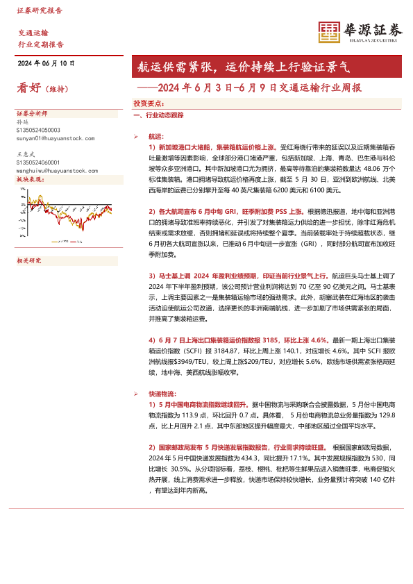 【华源证券】【20240610】交通运输行业周报:航运供需紧张,运价持续上行验证景气-15页