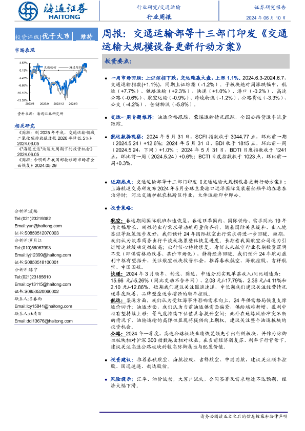 交通运输 市场表现 投资策略 政策文件 设备更新