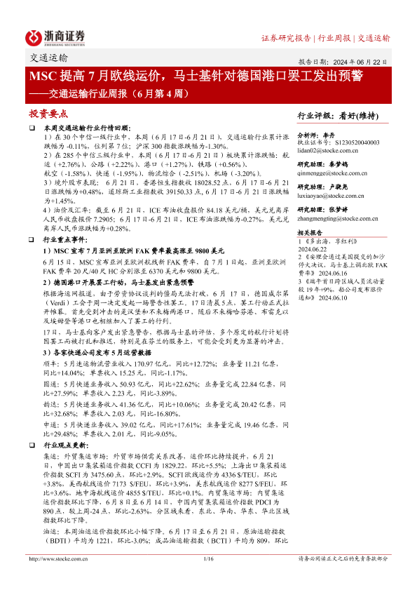 【浙商证券】【20240622】MSC提高7月欧线运价,马士基针对德国港口罢工发出预警-16页