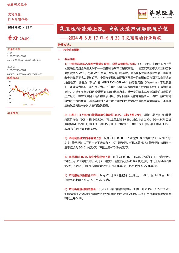 【华源证券】【20240623】交通运输行业周报:集运运价连续上涨,重视快递回调后配置价值-15页