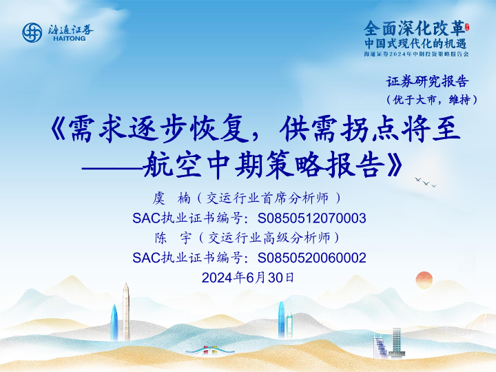 【海通证券】【20240630】需求逐步恢复,供需拐点将至——航空中期策略报告-22页