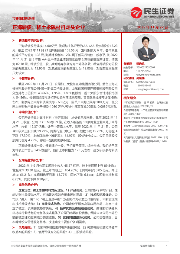 【民生证券】【20221122】可转债打新系列:正海转债,稀土永磁材料龙头企业-17页