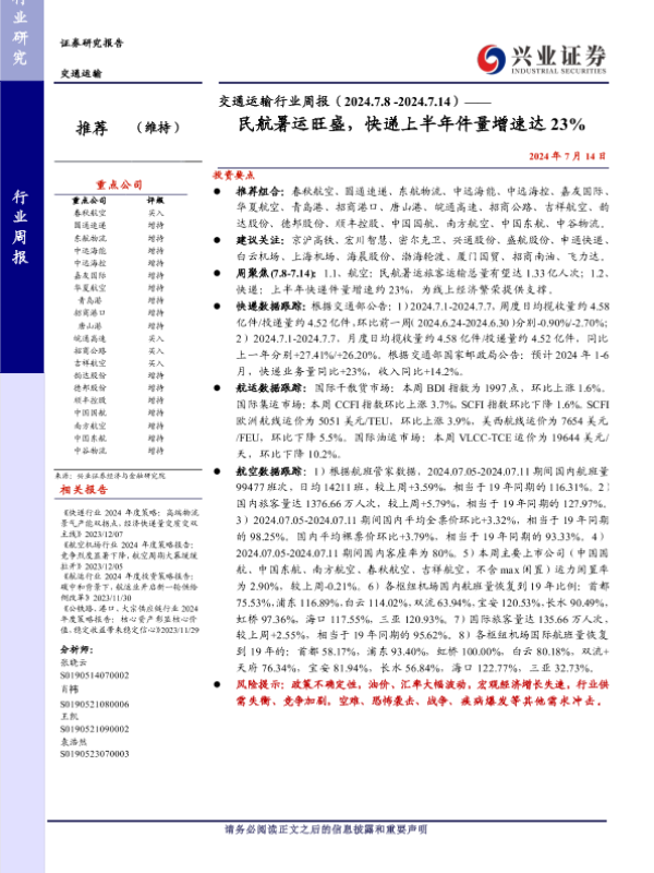 【兴业证券】【20240714】交通运输行业周报:民航暑运旺盛,快递上半年件量增速达23%-21页