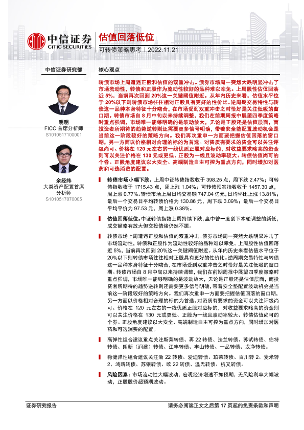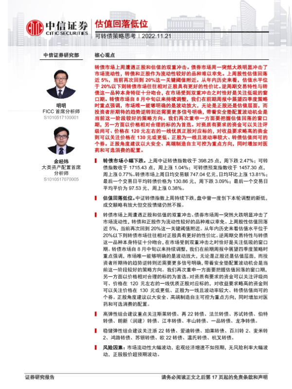 【中信证券】【20221121】可转债策略思考:估值回落低位-17页