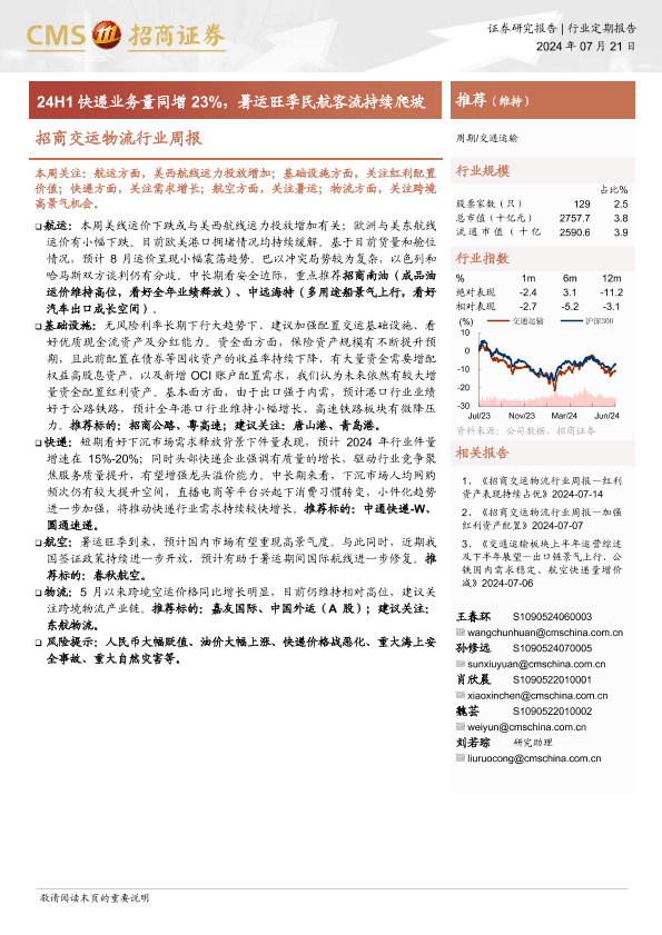 【海通证券】【20240721】招商交运物流行业周报:24H1快递业务量同增23%,暑运旺季民航客流持续爬坡-15页