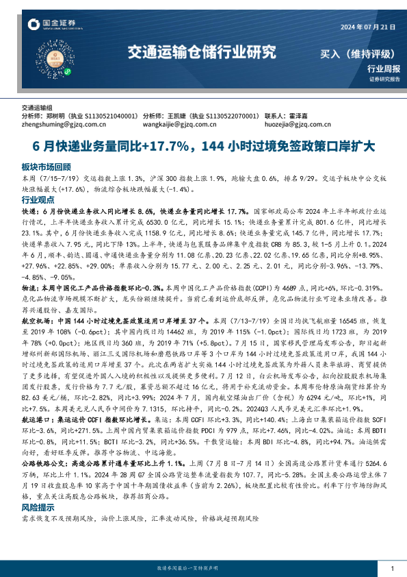 【国金证券】【20240721】交通运输行业周报:6月快递业务量同比+17.7%,144小时过境免签政策口岸扩大-15页