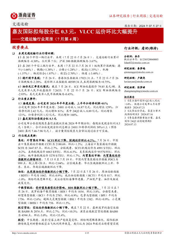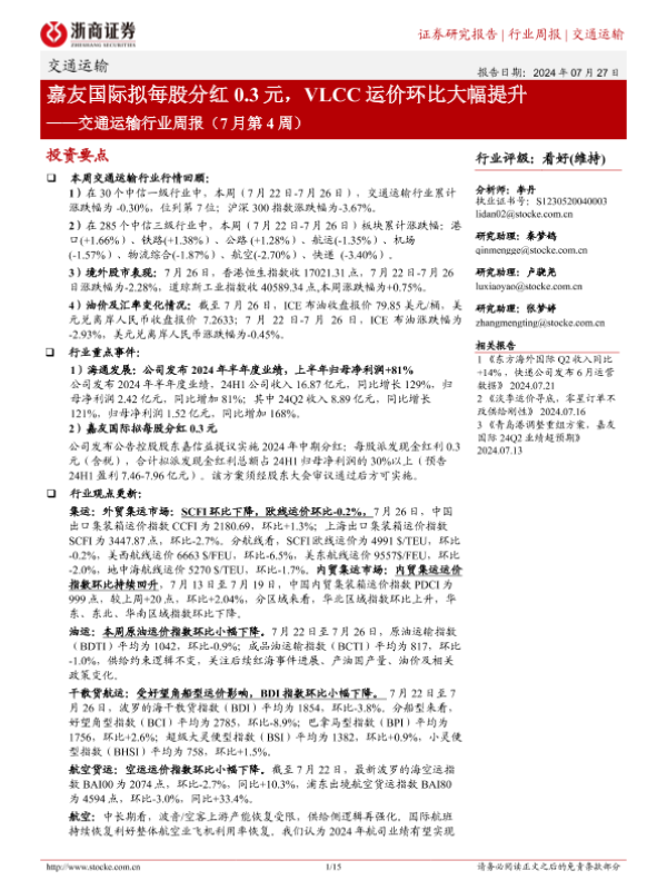 【浙商证券】【20240727】交通运输行业周报:嘉友国际拟每股分红0.3元,VLCC运价环比大幅提升-15页
