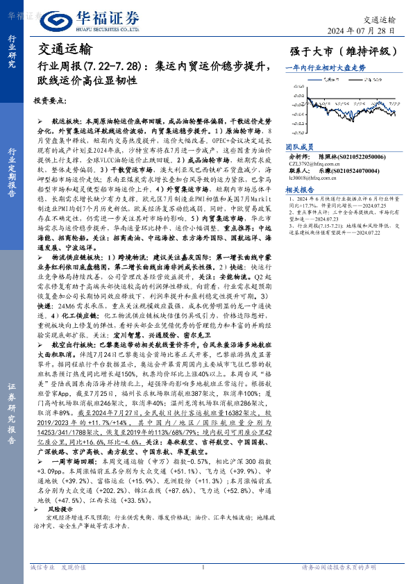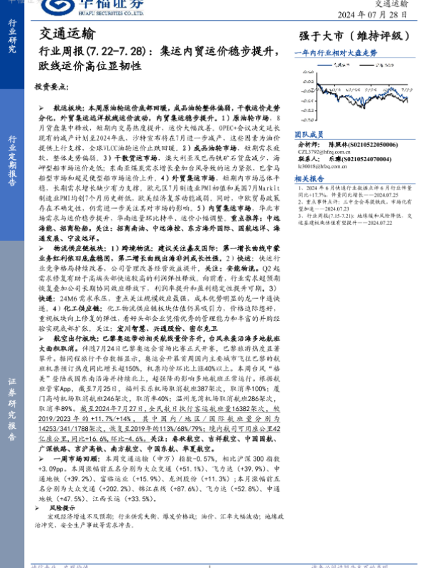 【华福证券】【20240728】交通运输行业周报:集运内贸运价稳步提升,欧线运价高位显韧性-16页