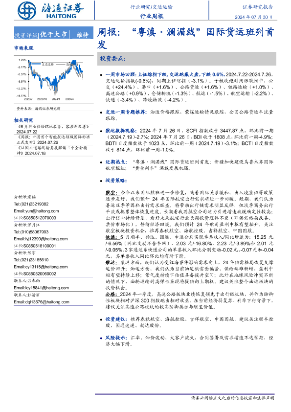 交通运输 国际货运班列 投资策略 航运数据 行业周报