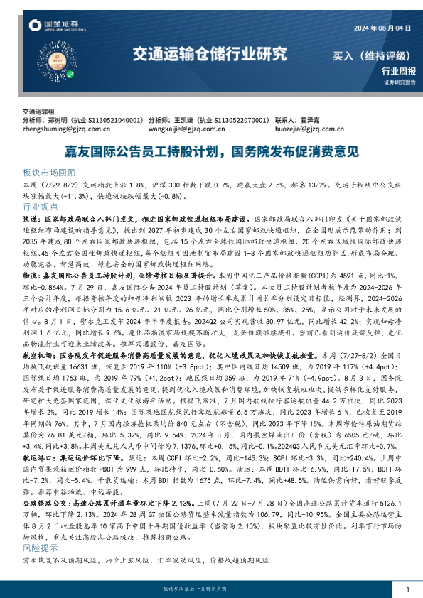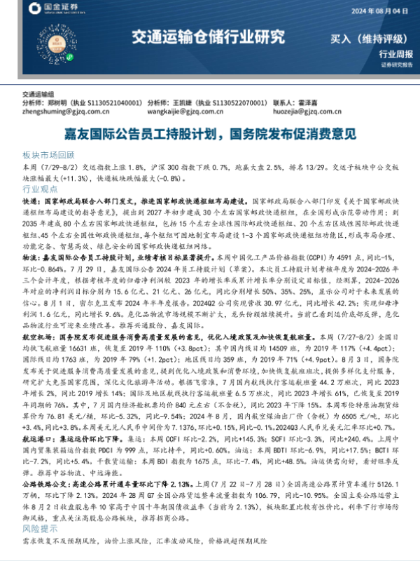 【国金证券】【20240804】交通运输仓储行业周报:嘉友国际公告员工持股计划,国务院发布促消费意见-15页