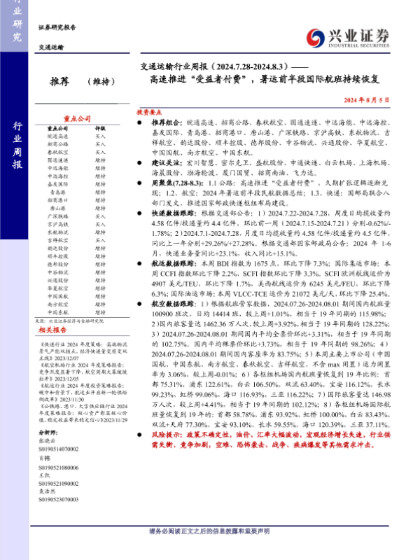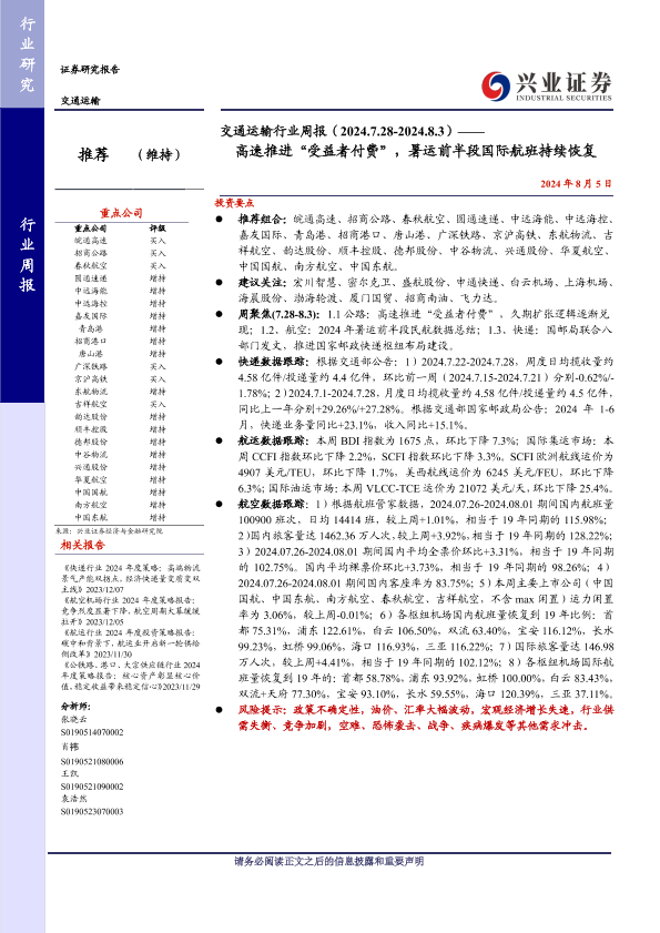 【兴业证券】【20240805】交通运输行业周报:高速推进“受益者付费”,暑运前半段国际航班持续恢复-23页