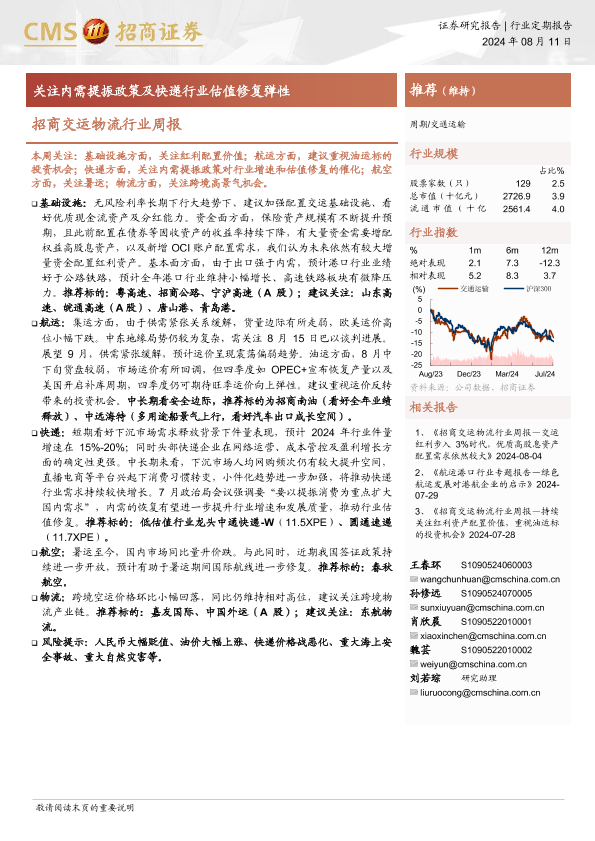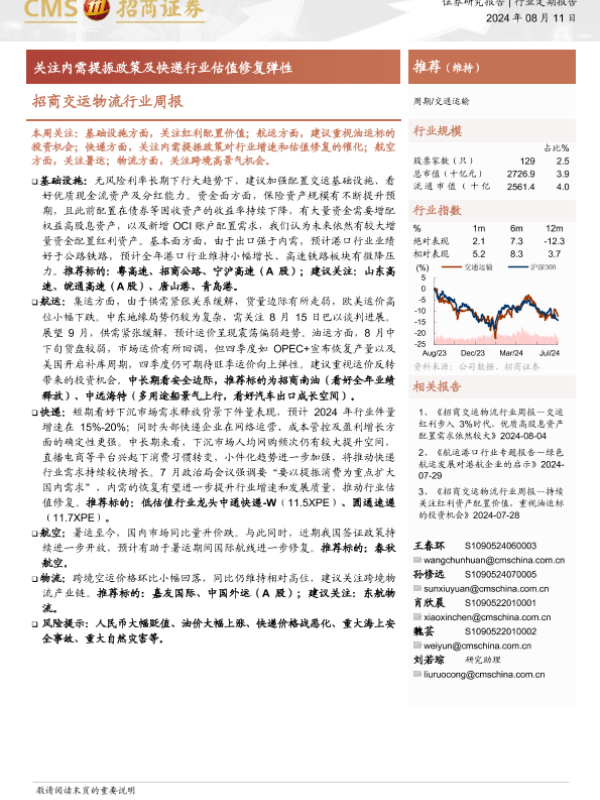 【海通证券】【20240811】招商交运物流行业周报:关注内需提振政策及快递行业估值修复弹性-15页