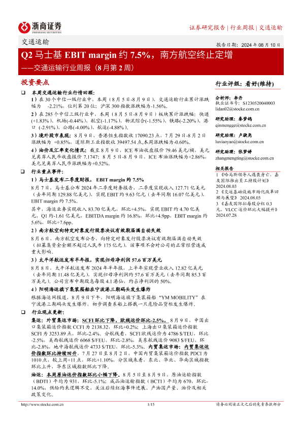 【浙商证券】【20240810】交通运输行业周报:Q2马士基EBIT margin约7.5%,南方航空终止定增-15页