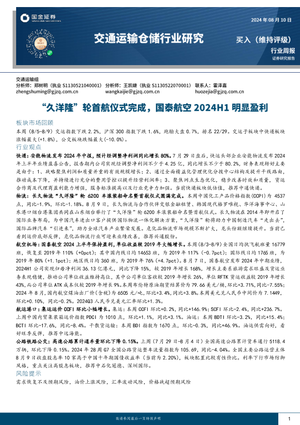 【国金证券】【20240810】交通运输仓储行业周报:“久洋隆”轮首航仪式完成,国泰航空2024H1明显盈利-15页