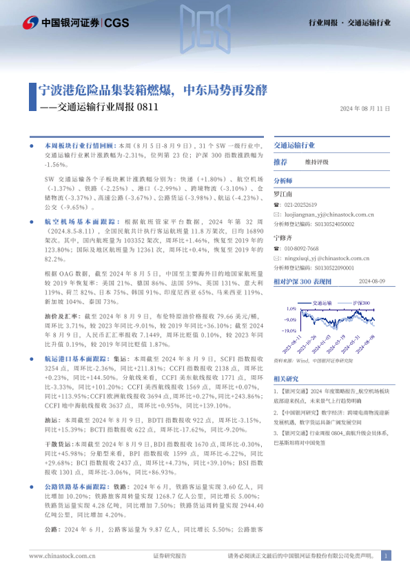 【银河证券】【20240811】交通运输行业周报:宁波港危险品集装箱燃爆,中东局势再发酵-21页