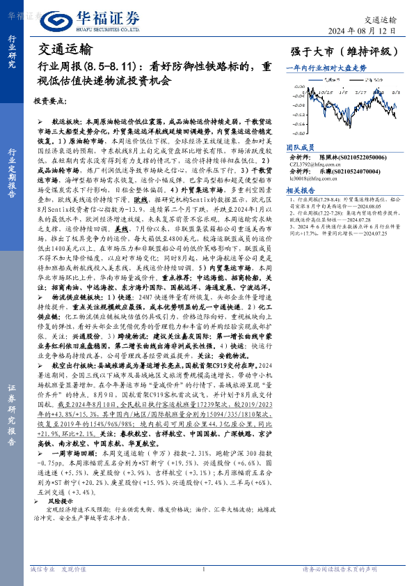 【华福证券】【20240812】交通运输行业周报:看好防御性铁路标的,重视低估值快递物流投资机会-15页