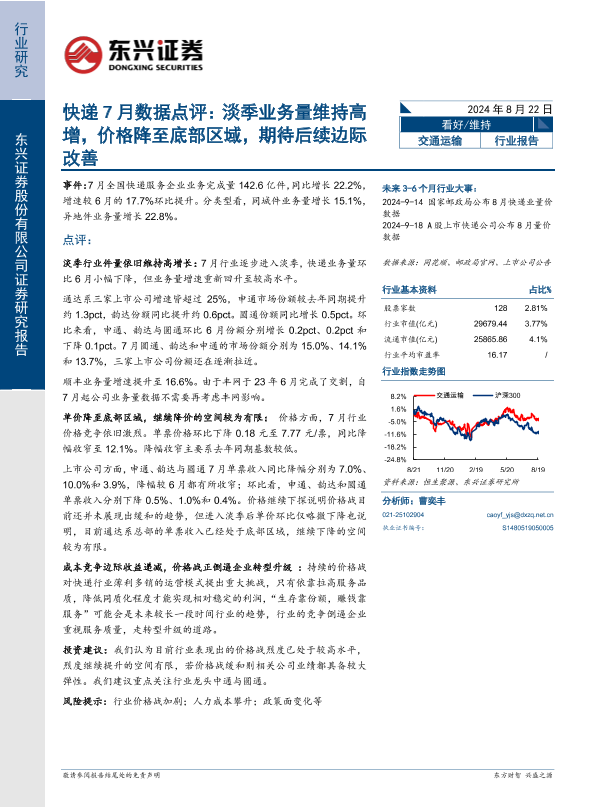 【东兴证券】【20240822】快递7月数据点评:淡季业务量维持高增,价格降至底部区域,期待后续边际改善-10页