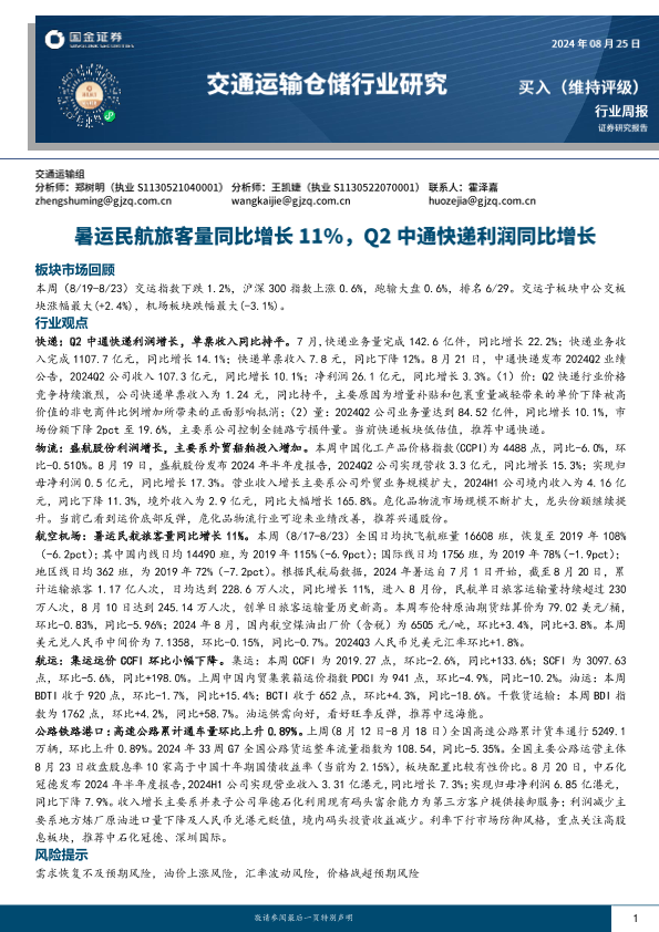 【国金证券】【20240825】交通运输仓储行业周报-15页