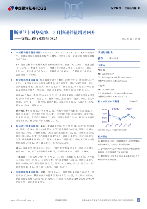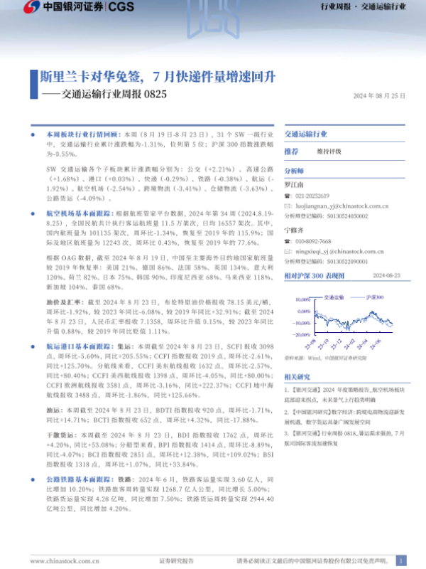 【银河证券】【20240825】交通运输行业周报:斯里兰卡对华免签,7月快递件量增速回升-21页