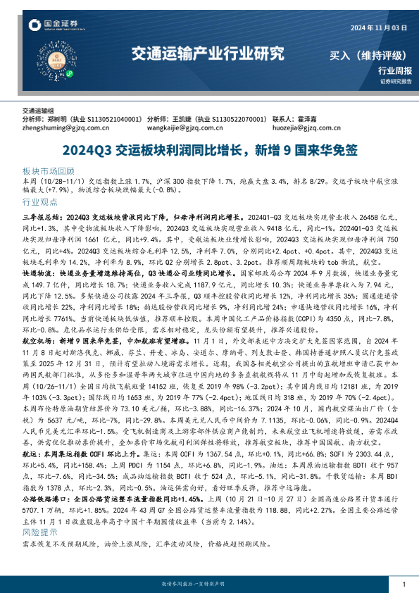 【国金证券】【20241103】2024Q3交运板块利润同比增长,新增9国来华免签-15页