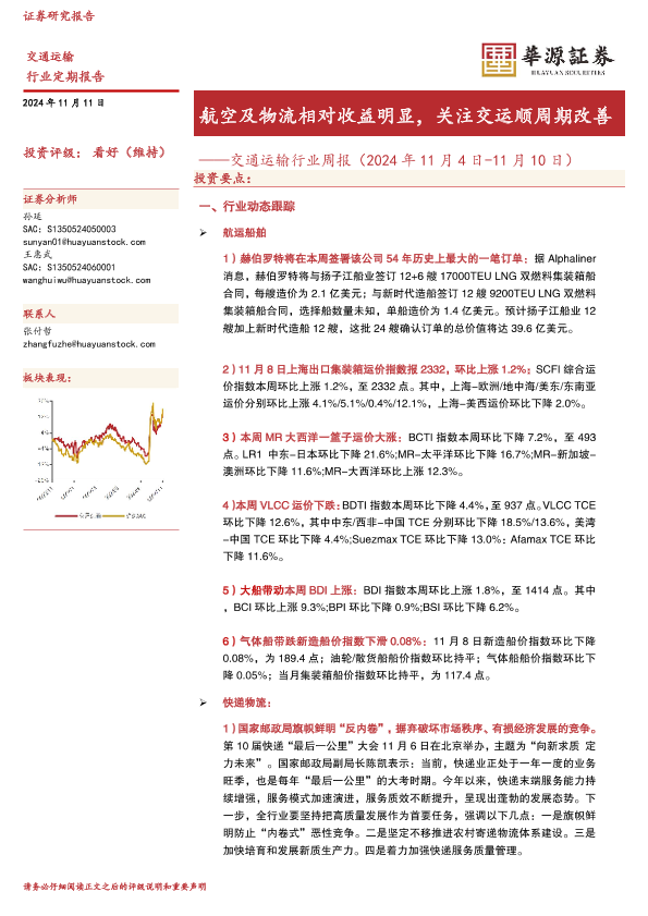 【华源证券】【20241111】交通运输行业周报:航空及物流相对收益明显,关注交运顺周期改善-14页