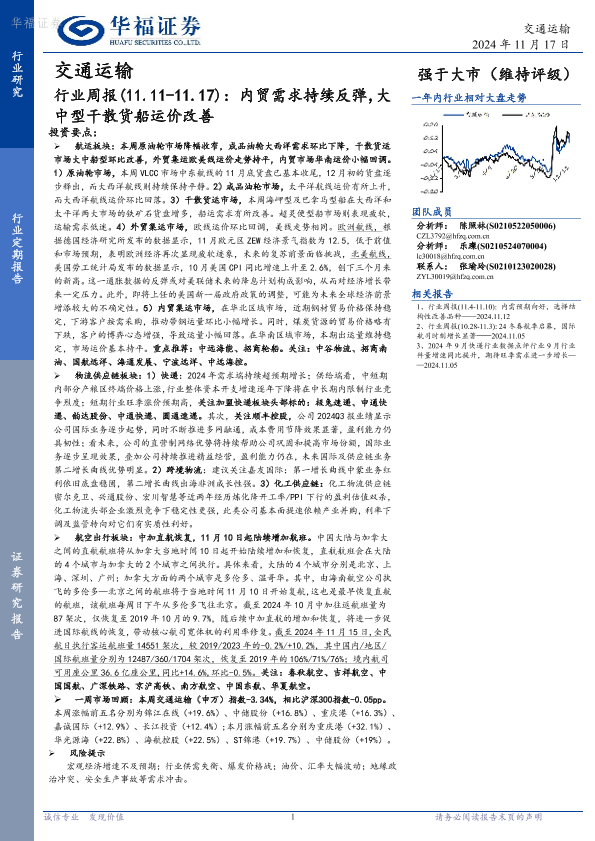 【华福证券】【20241117】交通运输行业周报:内贸需求持续反弹,大中型干散货船运价改善-15页