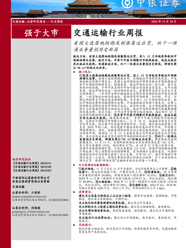 【中银证券】【20241118】交通运输行业周报:美国大选落地短期或刺激集运出货,双十一快递业务量创历史新高-26页