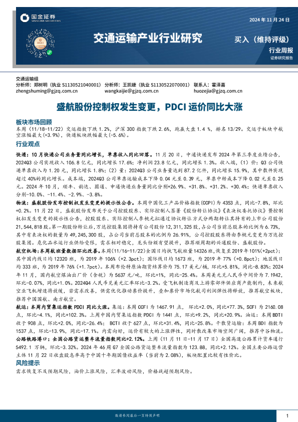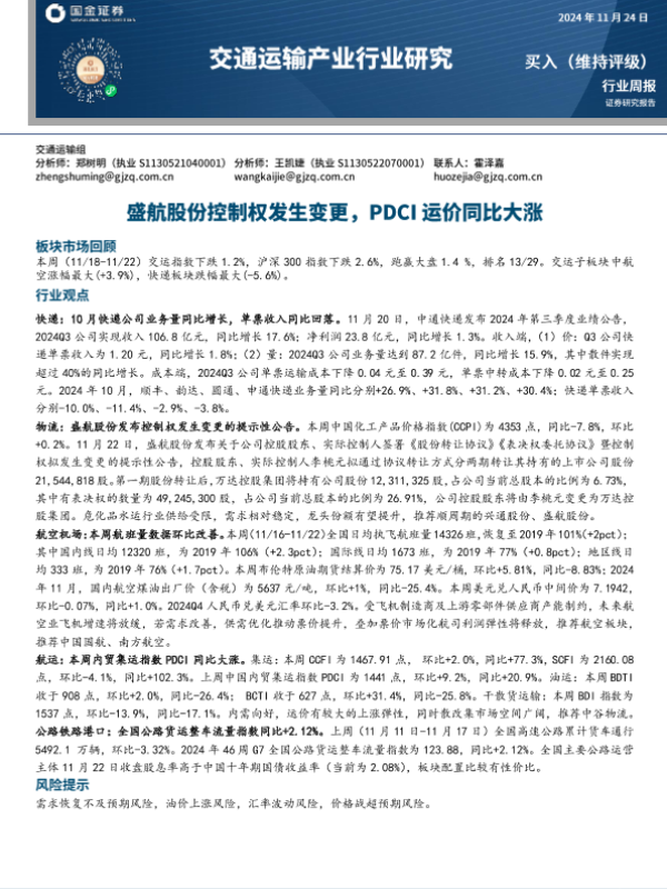 【国金证券】【20241124】交通运输产业行业研究:盛航股份控制权发生变更,PDCI运价同比大涨-15页