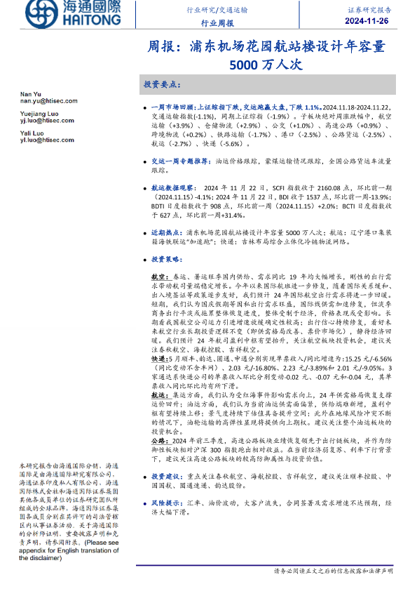 【海通国际】【20241126】交通运输周报:浦东机场花园航站楼设计年容量5000万人次-18页