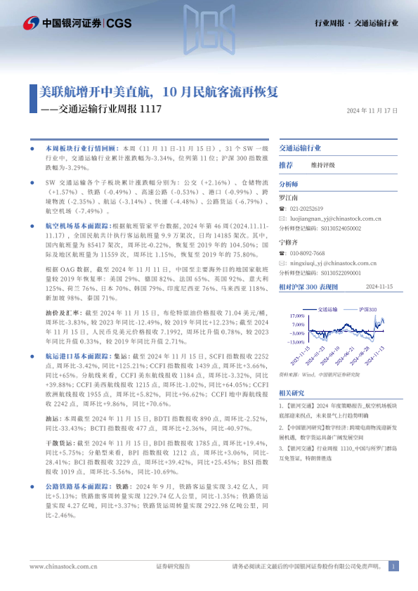 【银河证券】【20241117】交通运输行业周报:美联航增开中美直航,10月民航客流再恢复-21页