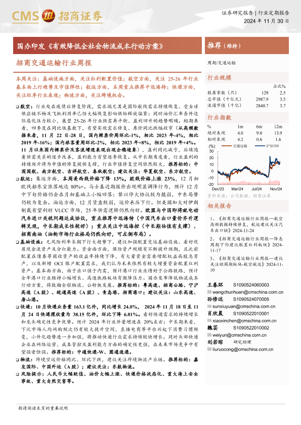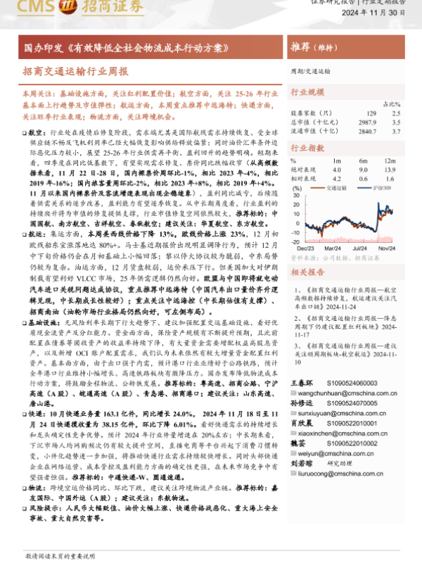 【海通证券】【20241130】招商交通运输行业周报:国办印发《有效降低全社会物流成本行动方案》-15页