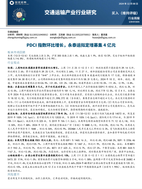 【国金证券】【20241208】交通运输产业行业研究:PDCI指数环比增长,永泰运拟定增募集4亿元-16页