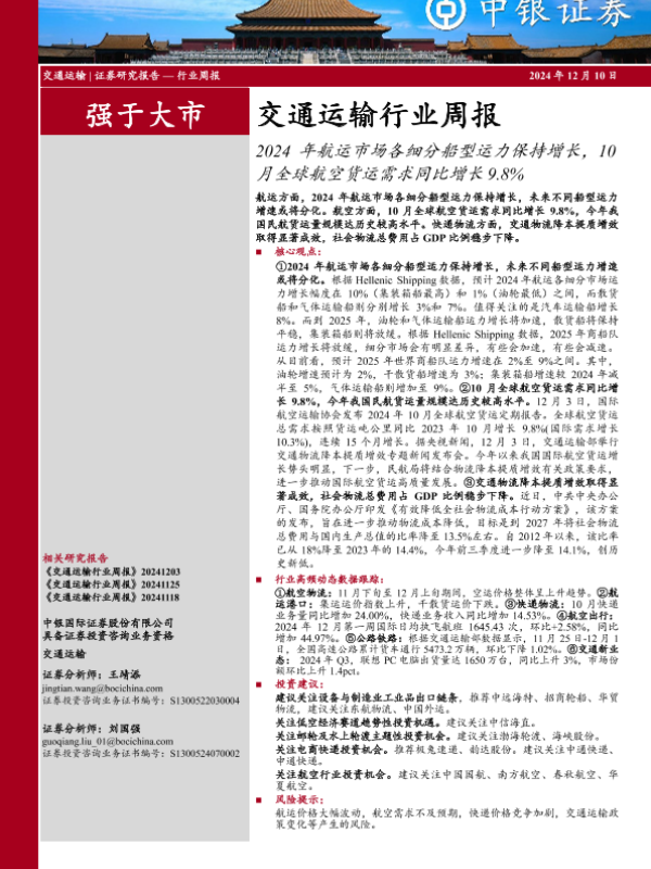 【中银证券】【20241210】2024年航运市场各细分船型运力保持增长,10月全球航空货运需求同比增长9.8%-25页