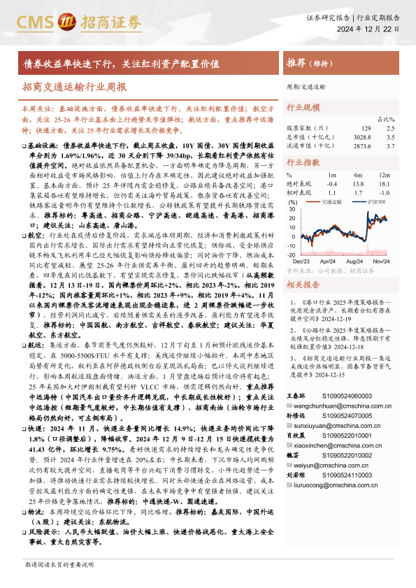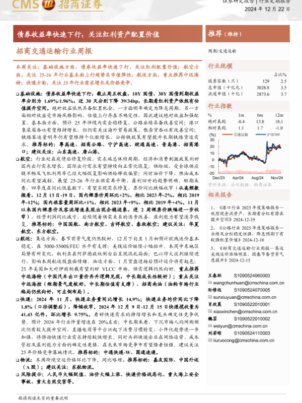 【海通证券】【20241222】招商交通运输行业周报:债券收益率快速下行,关注红利资产配置价值-15页