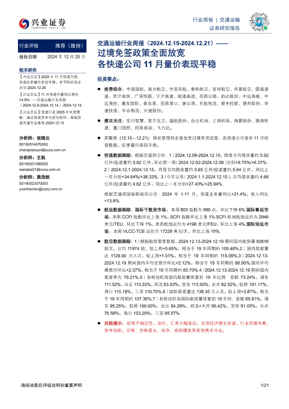 【兴业证券】【20241225】交通运输行业周报:过境免签政策全面放宽 各快递公司11月量价表现平稳-21页