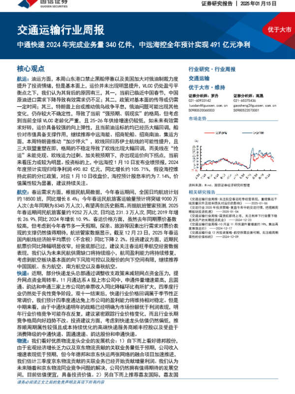 【国信证券】【20250115】交通运输行业周报:中通快递2024年完成业务量340亿件,中远海控全年预计实现491亿元净利-22页