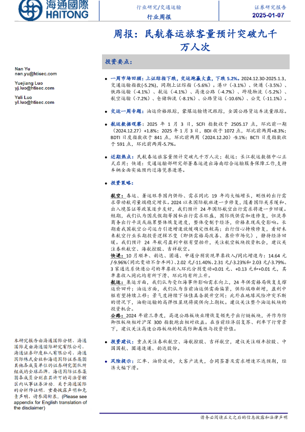 【海通国际】【20250107】交通运输行业周报:民航春运旅客量预计突破九千万人次-18页