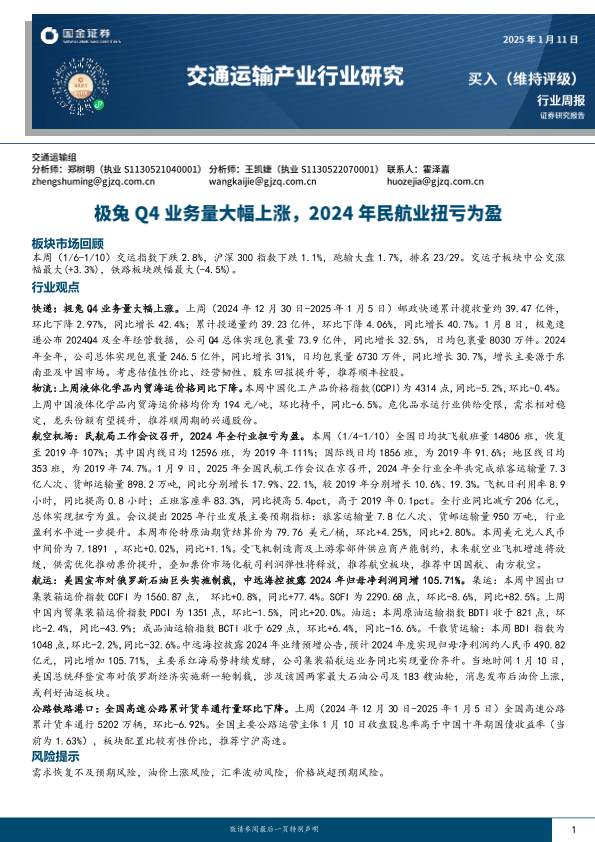 【国金证券】【20250111】交通运输产业行业研究:极兔Q4业务量大幅上涨,2024年民航业扭亏为盈-17页