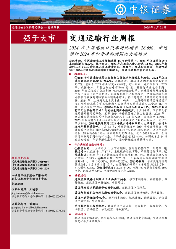【中银证券】【20250122】交通运输行业周报:2024年上海港出口汽车同比增长26.6%,申通预计2024年归母净利润同比大幅增长-25页