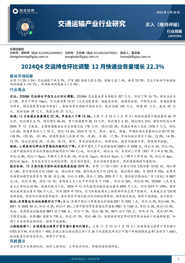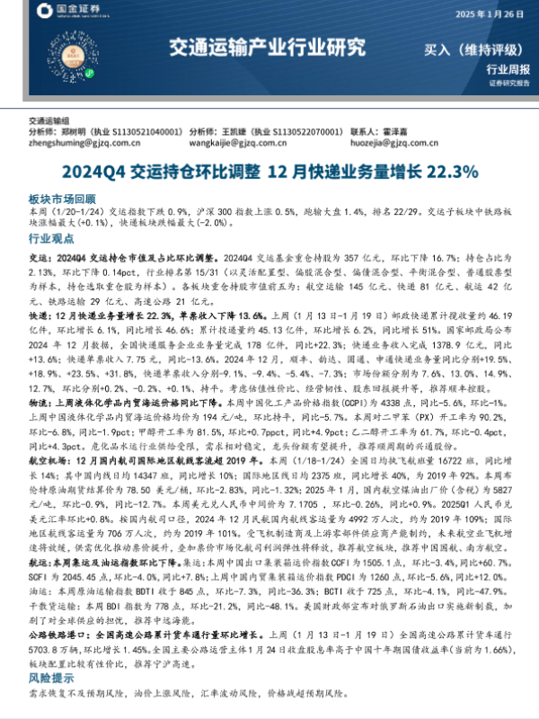 【国金证券】【20250126】2024Q4交运持仓环比调整 12月快递业务量增长22.3%-17页