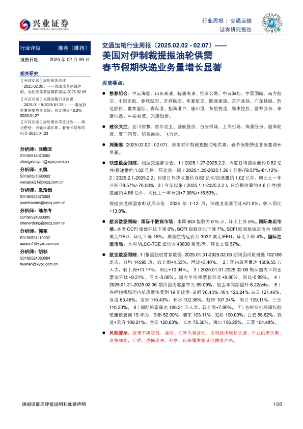 【兴业证券】【20250209】交通运输行业周报:美国对伊制裁提振油轮供需 春节假期快递业务量增长显著-20页