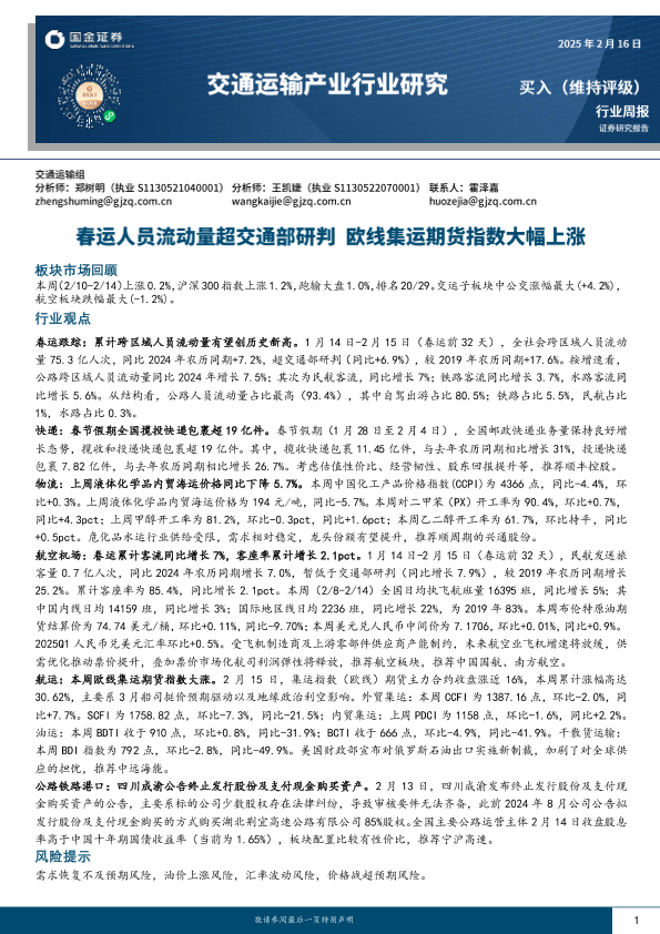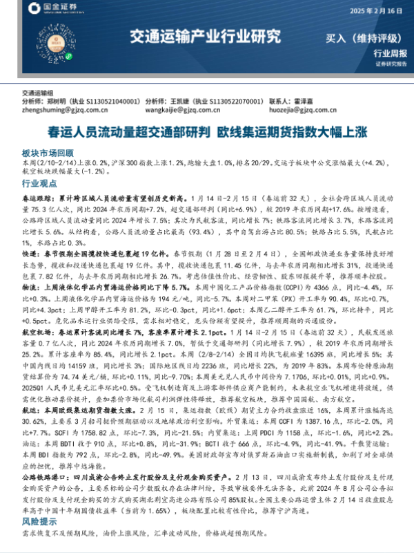 【国金证券】【20250216】交通运输产业行业研究:春运人员流动量超交通部研判 欧线集运期货指数大幅上涨-17页