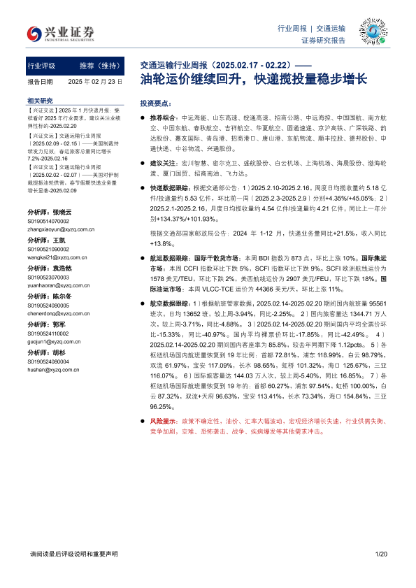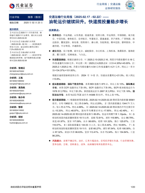 【兴业证券】【20250223】交通运输行业周报:油轮运价继续回升,快递揽投量稳步增长-20页
