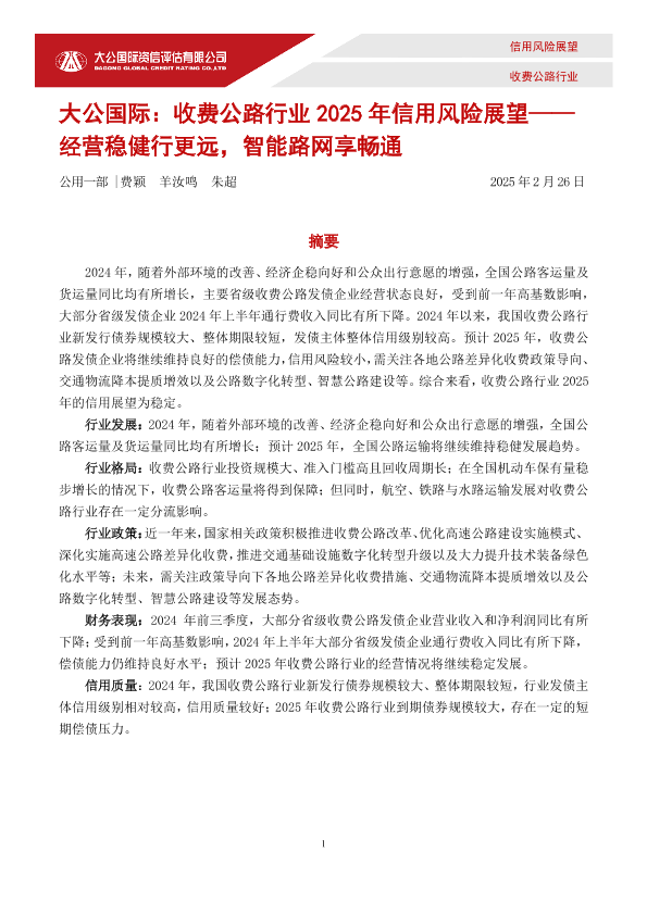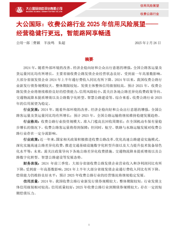 【大公国际】【20250226】收费公路行业2025年信用风险展望-10页