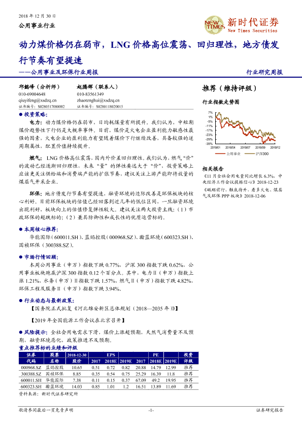 【新时代证券】【20181230】公用事业及环保行业周报:动力煤价格仍在弱市,LNG价格高位震荡、回归理性,地方债发行节奏有望提速-13页