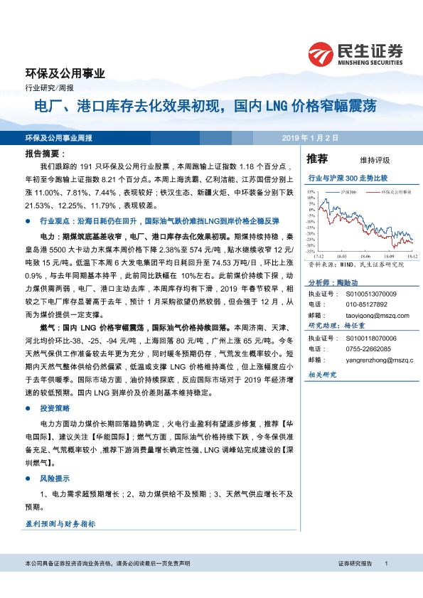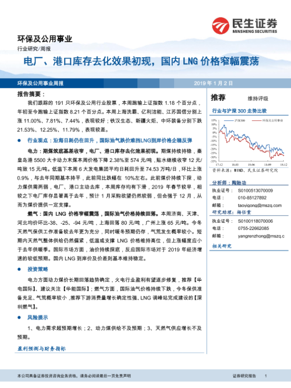【民生证券】【20190102】环保及公用事业行业研究周报:电厂、港口库存去化效果初现,国内LNG价格窄幅震荡-11页