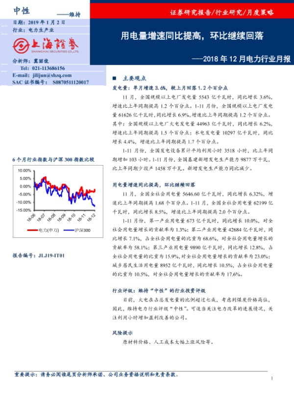 【上海证券】【20190102】2018年12月电力行业月报:用电量增速同比提高,环比继续回落-12页